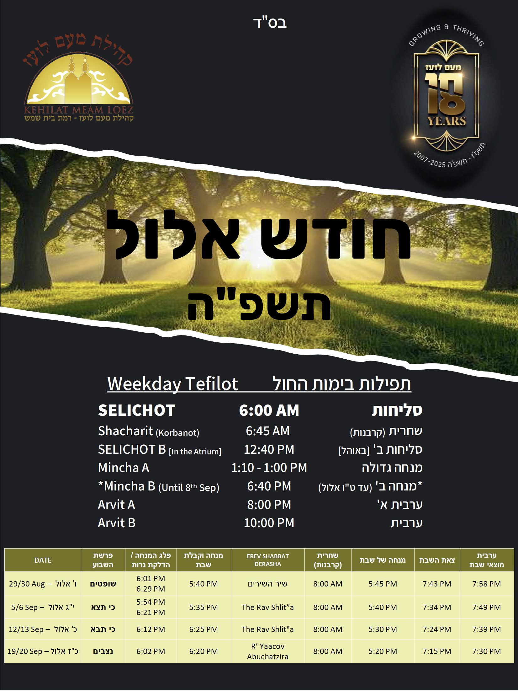 It’s easy to find a place to daven; Meam Loez is a place to belong. Centrally located in the heart of Ramat Beit Shemesh, our beautiful building has the zechut to serve as the home to thousands of hours of tefilla, Torah, chessed and community events, 365 days a year. Our Beit Kenesset is the beating heart of our community. Our weekly Kiddush, our tefillot, events, shiurim, smachot, and so much more, make it “a one-stop shop” for the spiritual and communal needs of the Torah Jew.